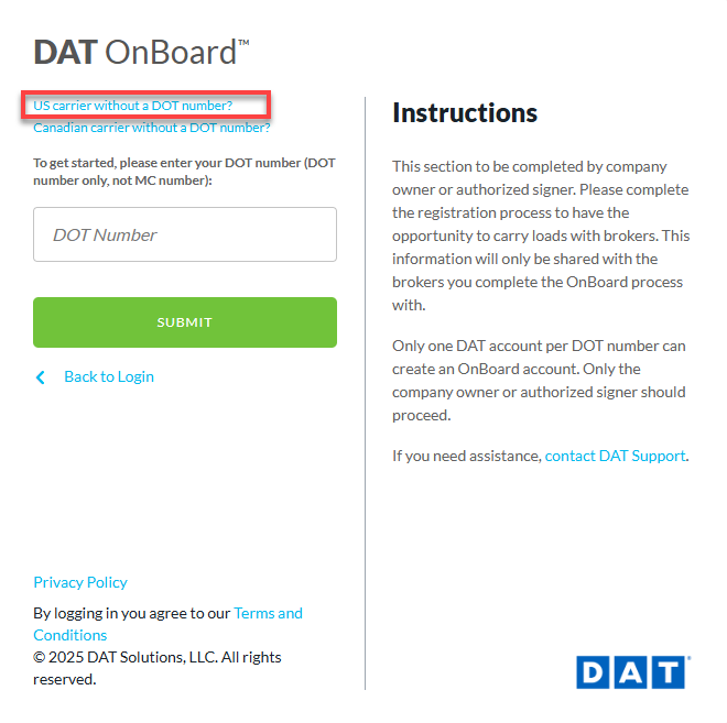 If you are a US carrier without a DOT number, select that option and provide us with your Home State and Intrastate Number and click Submit.